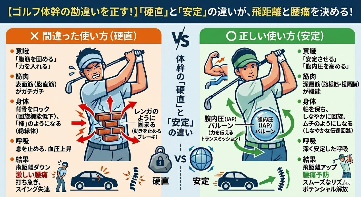 ここで、解剖学的な真実をお話しします。ゴルフにおいて腹筋が果たすべき真の役割は、身体を固めることではなく、**「腹内圧(IAP)」**を高めて内側から軸を支えることです。